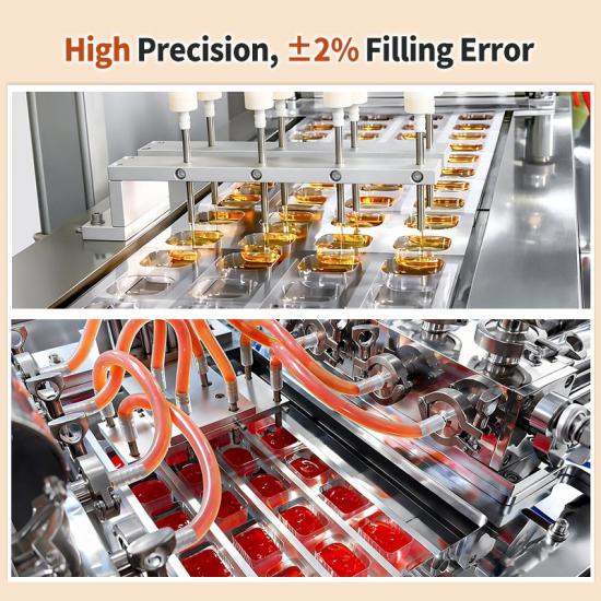 Ideal für die Verpackung von Marmelade, Butter, Ketchup, Salatdressings, Schokoladenpaste, flüssigen Würzmitteln und anderen Lebensmitteln. Dank des schnellen Formenwechsels ist die Produktion verschiedener Spezifikationen und Geschmacksrichtungen möglich. Die lebensmittelberührenden Teile entsprechen internationalen Lebensmittelsicherheitsstandards, und das stabile Füll- und Verschließsystem gewährleistet absolute Dichtheit und lange Haltbarkeit. Ob Sie eine Blisterverpackungsmaschine für Ketchup, Marmelade, Butter oder Schokolade benötigen – unsere Anlagen bieten die perfekte Lösung.
