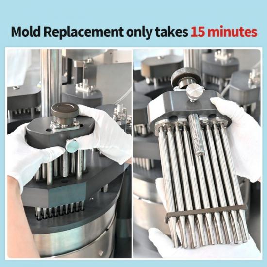Die modularen Formen der Kapselfüllmaschine unterstützen Kapselgrößen von #000 bis #5. Der Größenwechsel erfolgt schnell. Bediener können die Standardanleitung zur Bedienung und Wartung der Maschine von Rich Packing befolgen. In der Regel dauert der Wechsel 20 Minuten. Diese Flexibilität ermöglicht Unternehmen eine schnelle Anpassung ihrer Produktionspläne. Sie können den Anforderungen der Produktion unterschiedlicher Kapselgrößen gerecht werden. Dies verbessert die Produktionseffizienz und die Anlagenauslastung zusätzlich.
